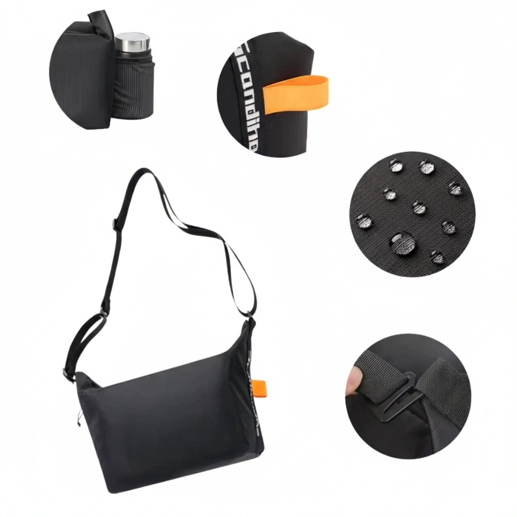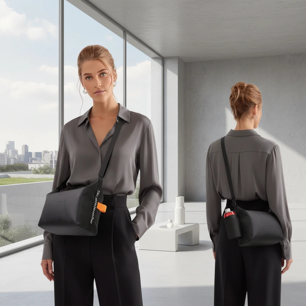 - Nómada gracias a la correa de hombro extraíble (solo en negro, ajustable de 61 a 119 cm) con un discreto bolsillo lateral para botella