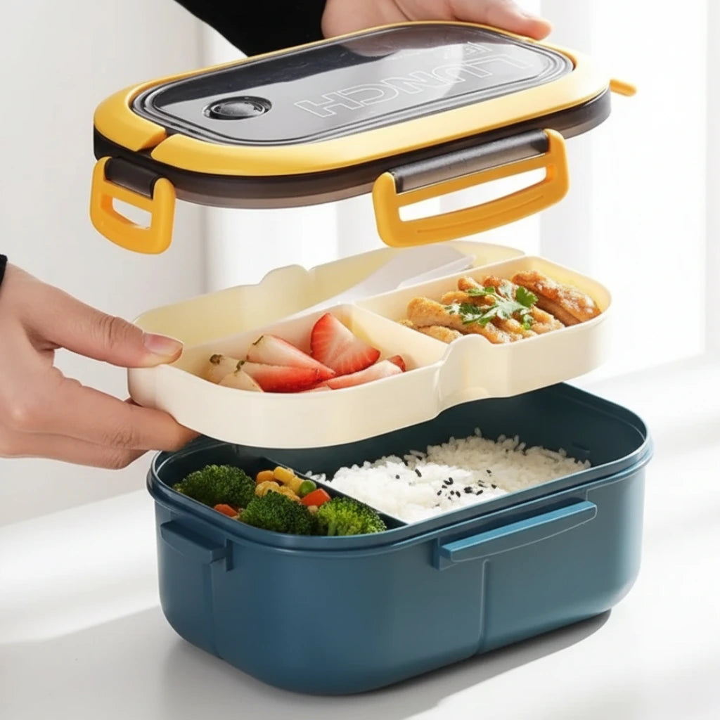 Su diseño compartimentado con rejilla mantiene los alimentos frescos sin que se mezclen los sabores. La tapa con cierre hermético garantiza un transporte seguro y sin fugas, mientras que el asa integrada facilita su transporte.
